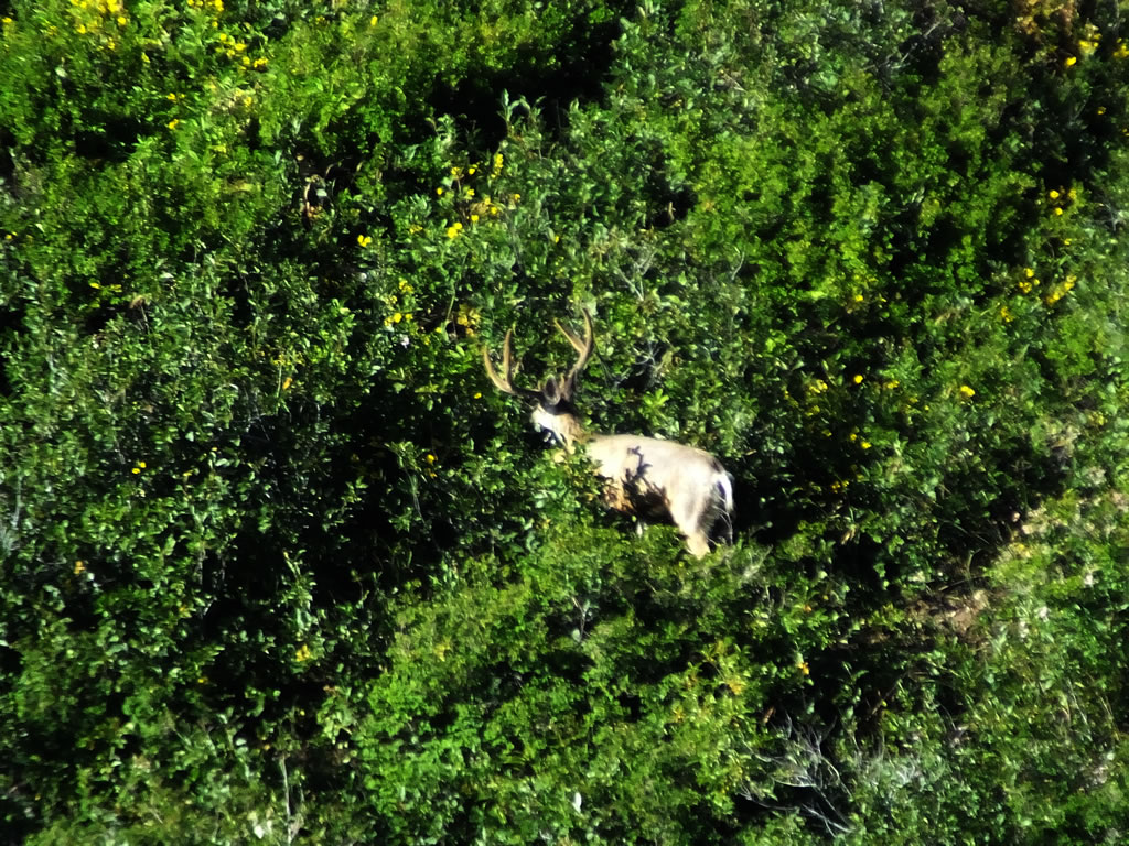 We weren't sure if the buck was Whitey or not until we got to him. Sure enough, it was. A very nice mature buck with awesome heavy burly bases. The buck was in a "super bed" dug out under the chaparral for maybe decades. The buck had stood up out of the bed and Dallen dropped him off the front edge of his bed.