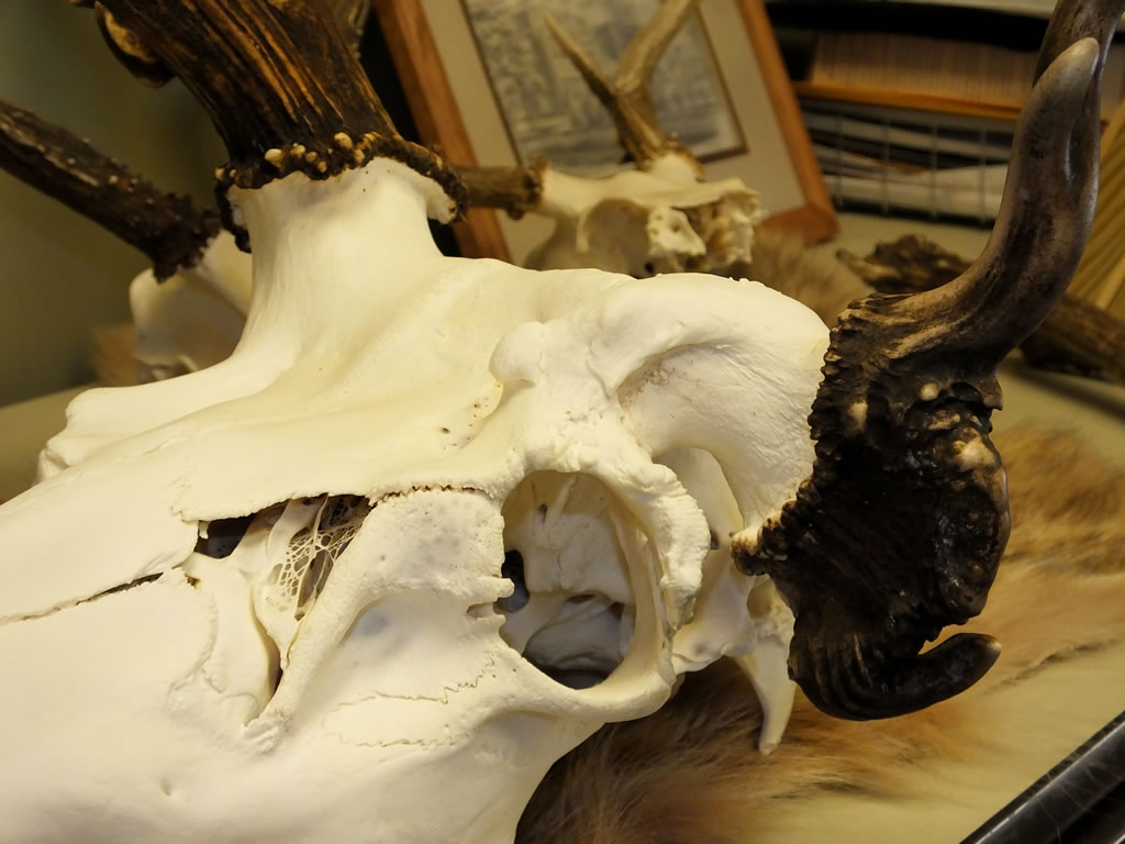 European Skull mount of Charlie One Horn. Because the one antler is so heavy we have not been able to find a way to mount him on the wall. So for now he makes for a great desktop mount.