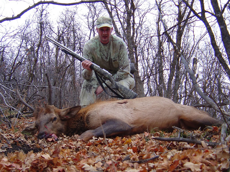 Opening day I hobbled around for a couple of hours trying to locate some elk. I started a little to high on the mountain and spotted a nice bull way below me. I worked my way down the maintain cow calling every once in a while. When I got the the general area where I saw the bull he was nowhere to be found. I started working my way around the mountain at this lower elevation and cow called at one point. Immediately something came crashing through the oak brush straight toward me. It was a spike elk, excellent tasting meat for the frying pan. He popped out of the brush at 20 yards and I gave him a face full of smoke and a hefty super slug to the chest.